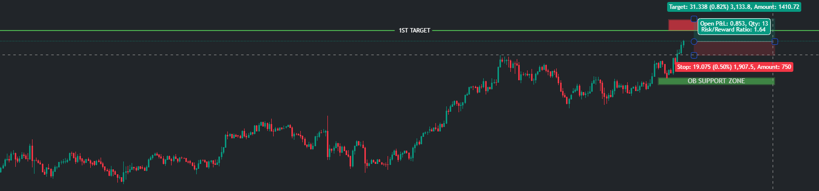 Break of Structure (BoS): Each upward impulse has broken prior resistance levels, reinforcing the bullish trend. The most recent move established a new higher high, confirming continuation.