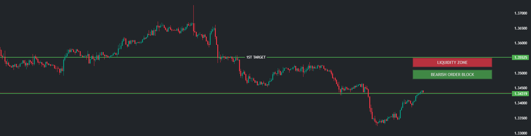 Liquidity Zones: Upward, there is liquidity around the 1.3520 – 1.3550 zone (potential stop-hunt area). Downward, the most recent low at 1.3300 – 1.3320 remains a key liquidity zone.